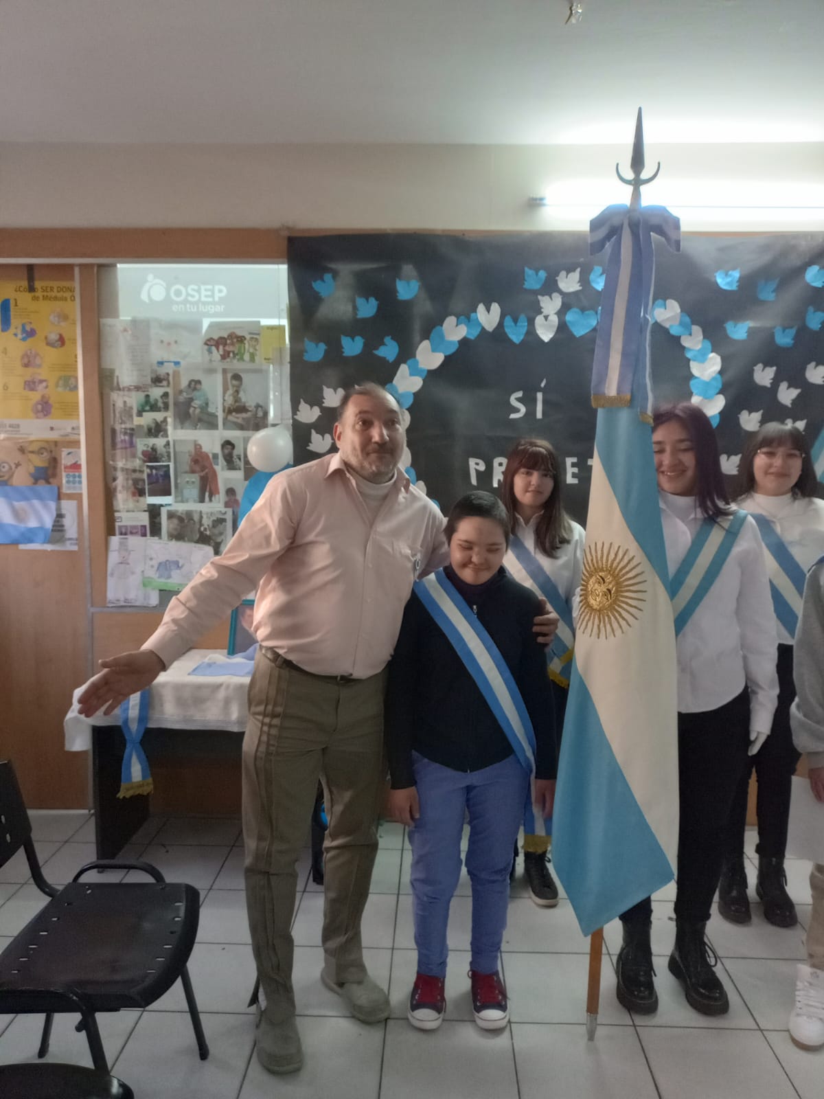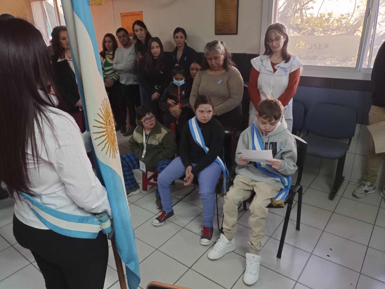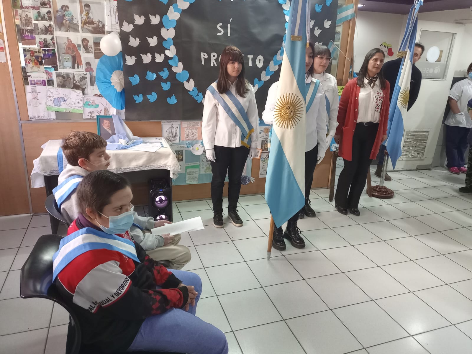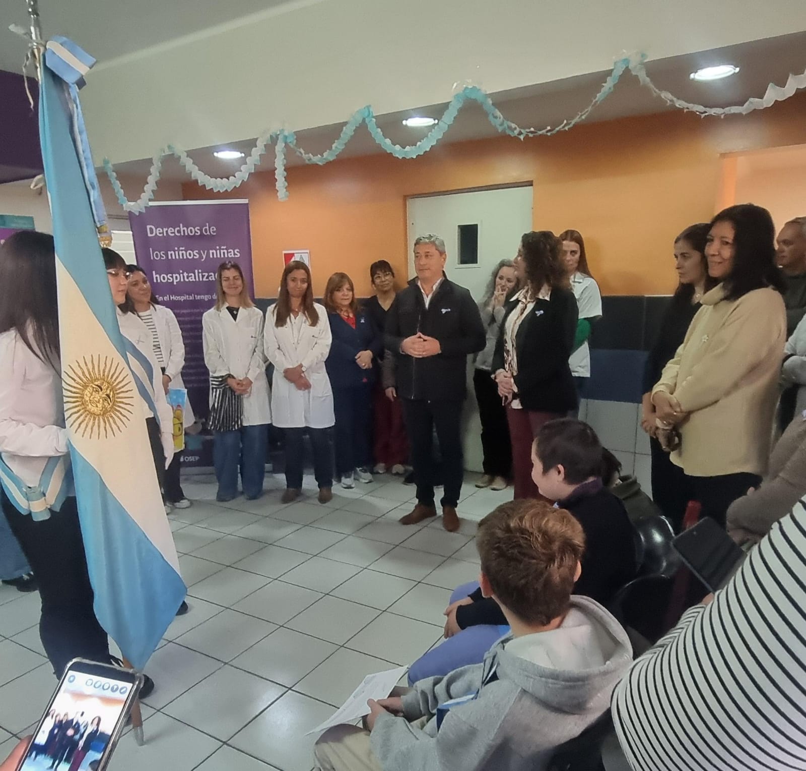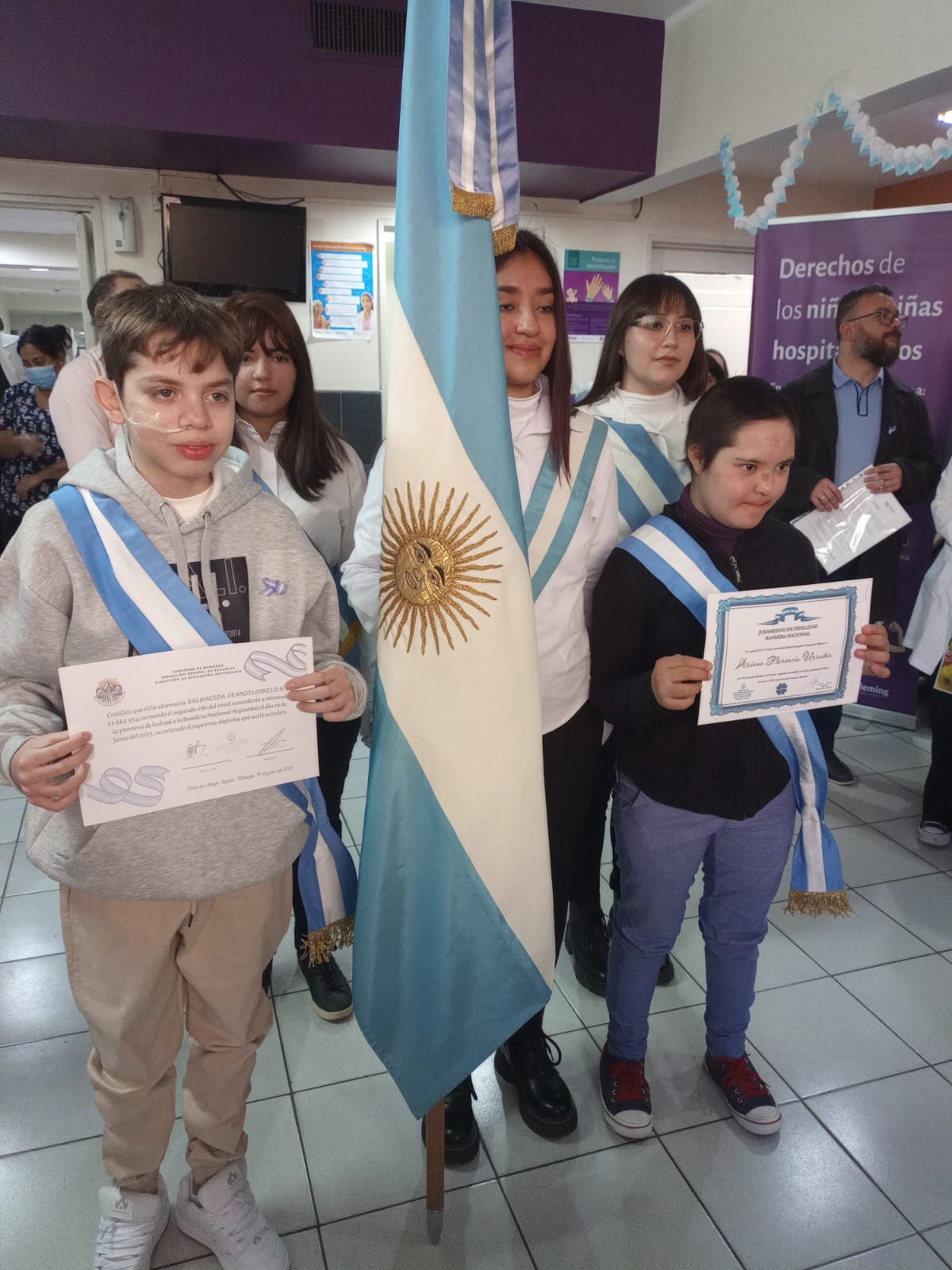 El doctor Carlos Funes expresó su profundo agradecimiento al equipo de trabajo del hospital, a las autoridades y profesores de la DGE por acompañar a los niños en su proceso educativo, así como a las familias que diariamente asisten a sus pacientes internados. Dirigiéndose a los protagonistas del día, Franco y Florencia, los felicitó por reafirmar su promesa de lealtad a la bandera.