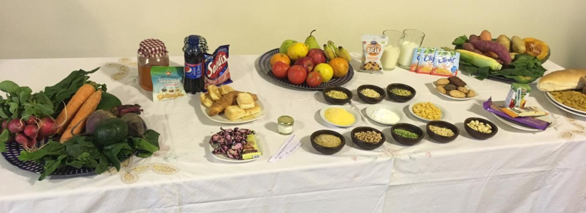 Más tarde, los profesionales de Nutrición prepararon una mesa con distintos alimentos que contienen carbohidratos, tales como panes integral y blanco, pastas, lácteos, frutas, verduras, legumbres, cereales, golosinas, bebidas azucaradas y alimentos refinados, de los cuales cada niño eligió uno para presentar.