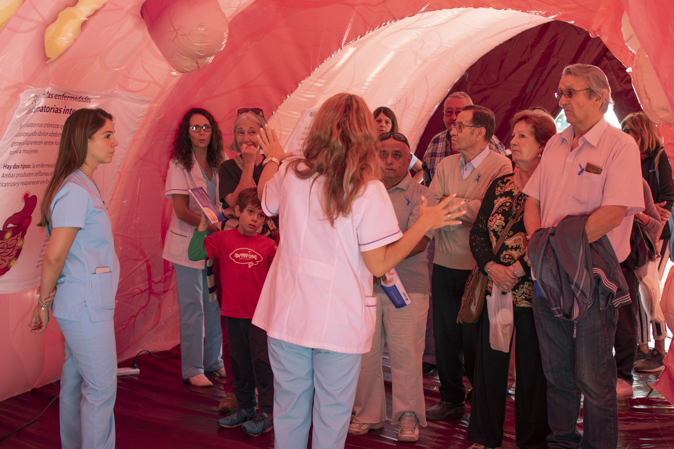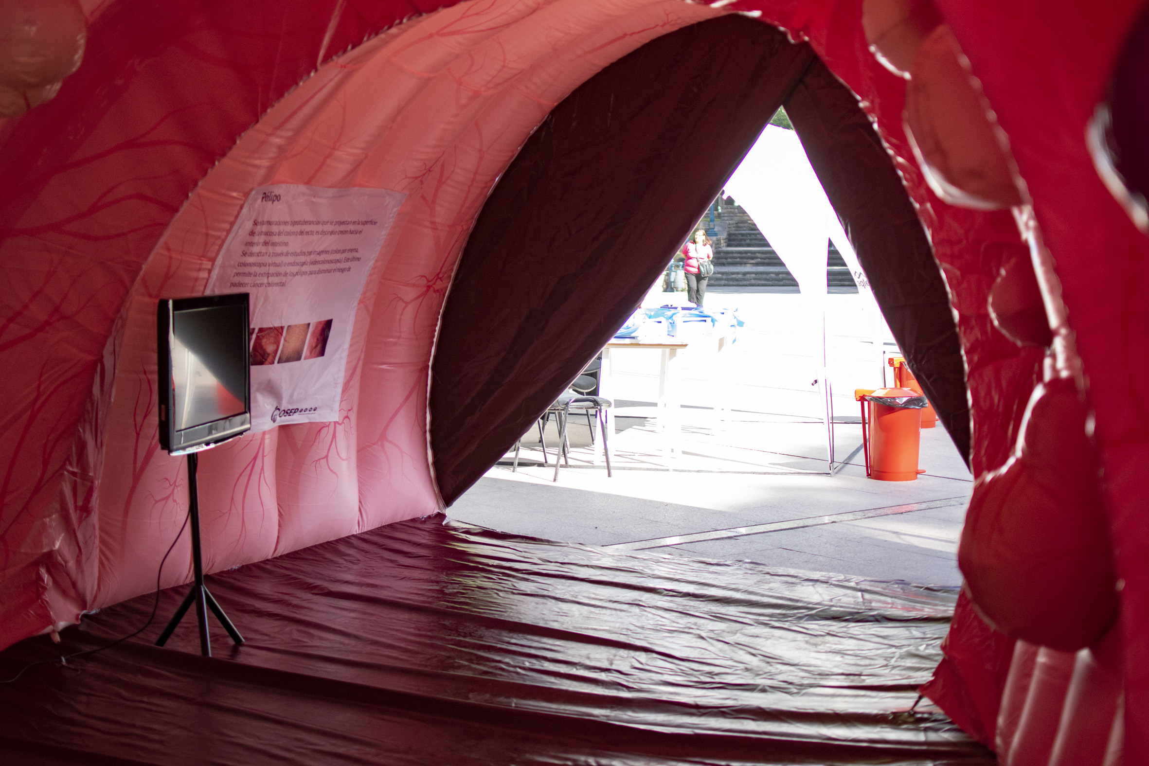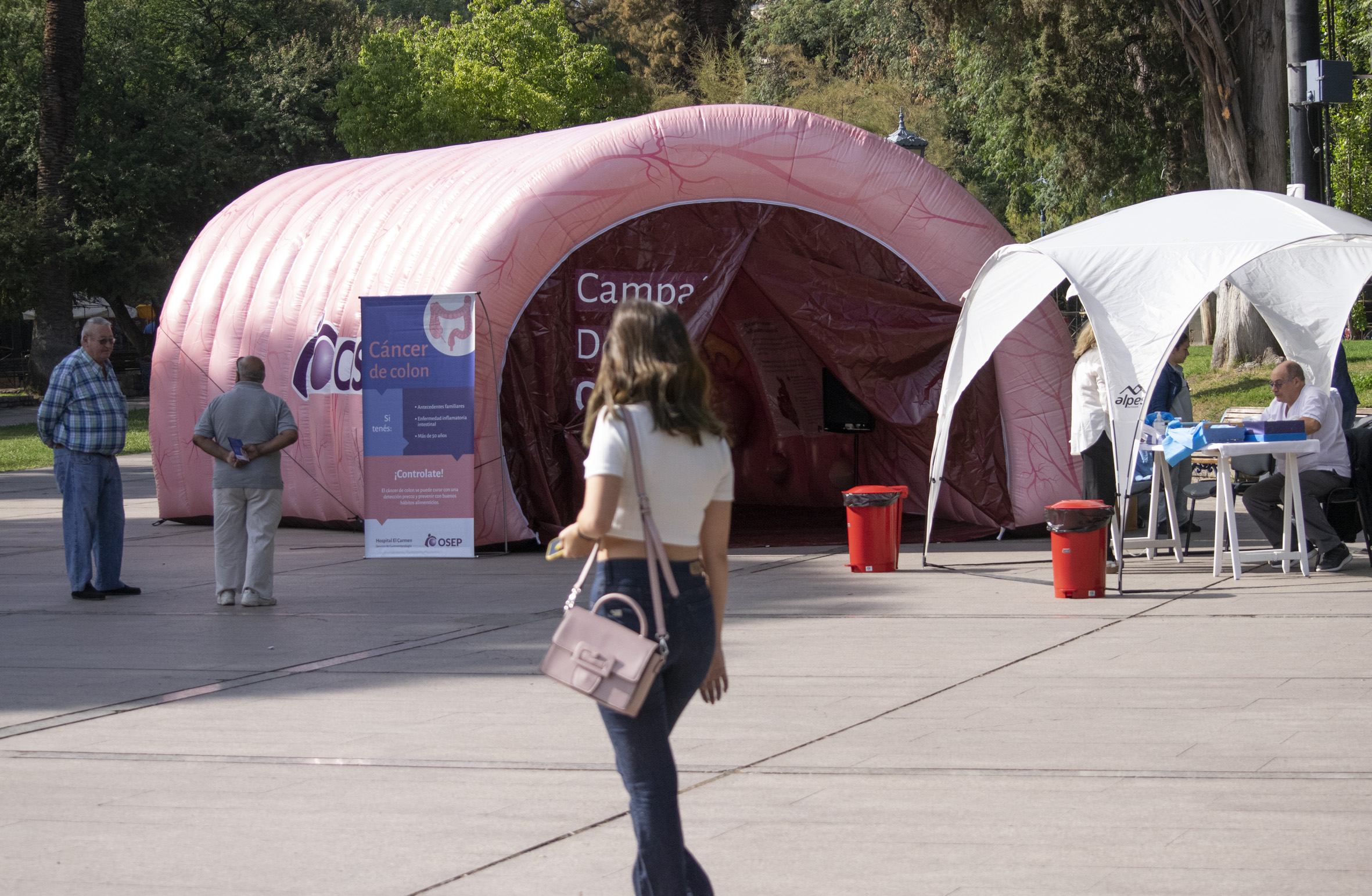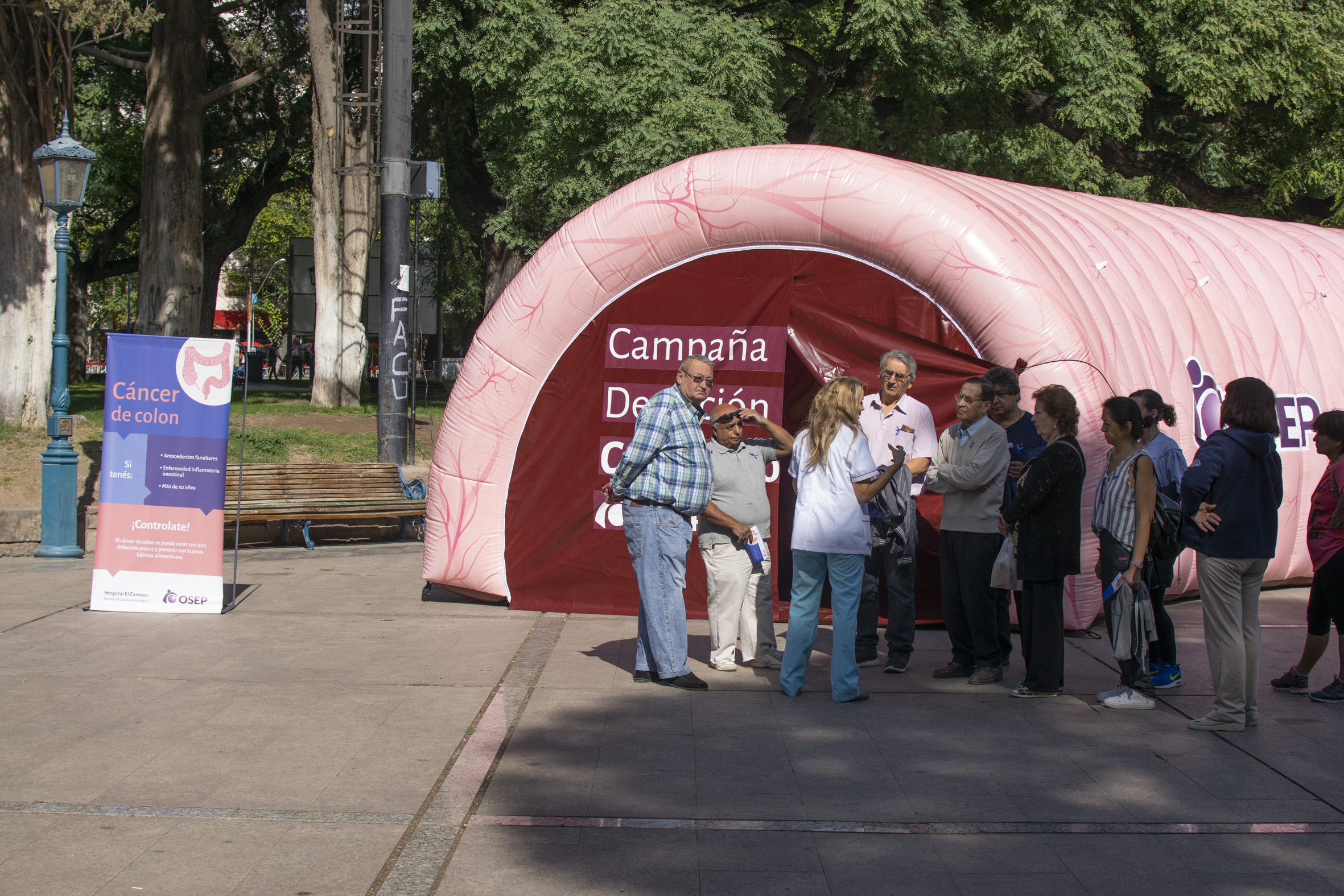 A través de un recorrido interactivo por un colon inflable de 9 metros de largo y 3 de ancho, profesionales de OSEP explicaron a transeúntes locales y turistas que circularon por la Plaza Independencia, el funcionamiento del sistema digestivo, las enfermedades precursoras de cáncer de colon y su prevención.