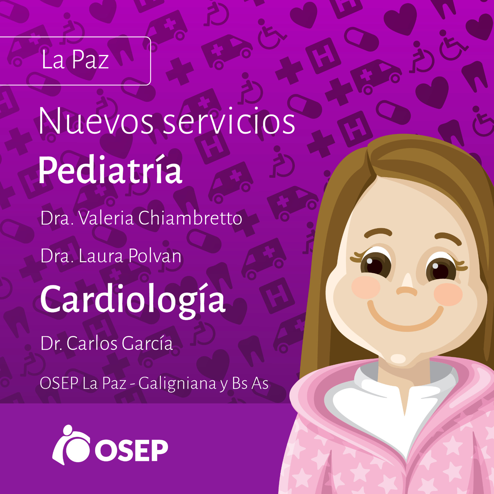 El edificio territorial de OSEP La Paz, ubicado en la esquina de Galigniana y Buenos Aires, sigue creciendo en la prestación de servicios. A partir de mayo, se suman nuevos servicios como Pediatría y Cardiología. Estos servicios se suman a un nutrido cronograma de prestaciones que podés conocer a continuación: