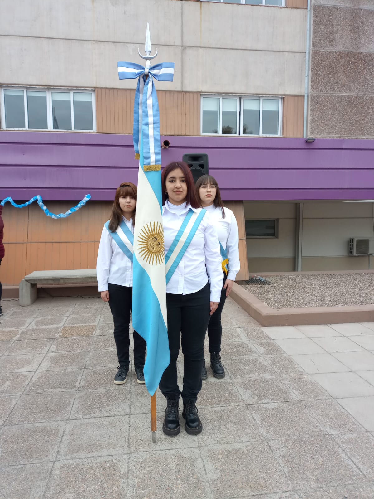 La ceremonia, cargada de simbolismo patrio, contó con la destacada presencia de la Bandera de Ceremonias de la Escuela 4-036 Raúl Scalabrini Ortiz, que engalanó el acto. La enseña fue portada con orgullo por la Abanderada Nacional, Romina Abigail Moyano, acompañada por sus escoltas Ayelén Nerea Rosales Velázquez (Primera Escolta Nacional) y Delfina Milagros Herrera Muñoz (Segunda Escolta Nacional).
