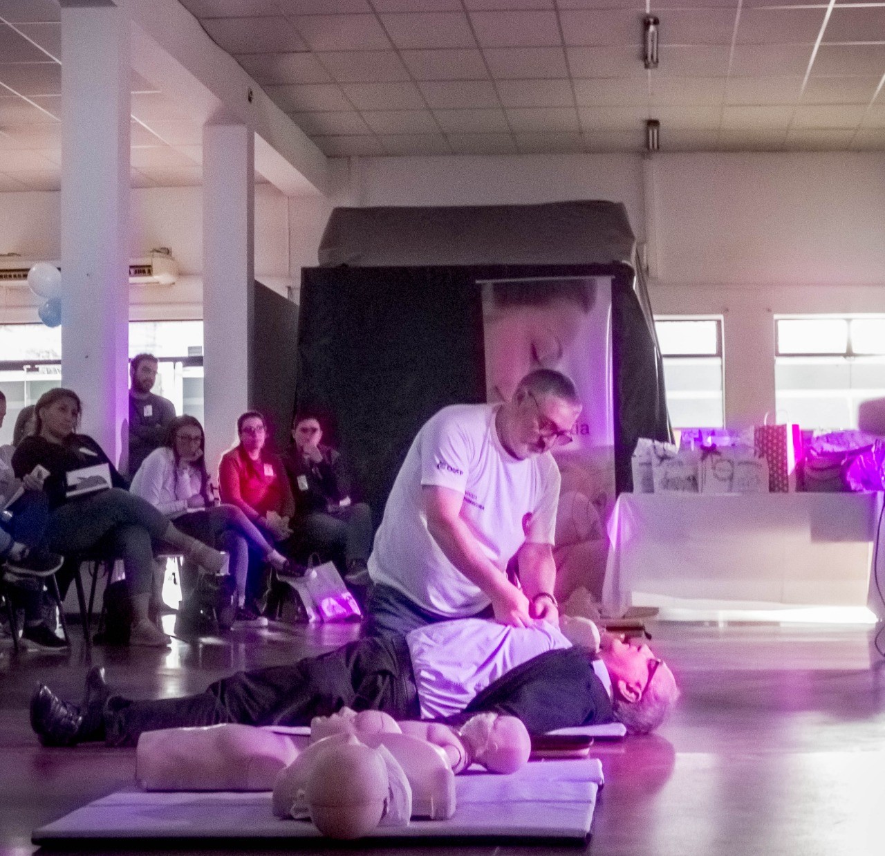 La charla principal tuvo que ver con técnicas de Reanimación Cardiopulmonar (RCP). Este procedimiento consiste en aplicar presión rítmica sobre el pecho de una persona que se encuentra en paro cardiorrespiratorio para que el oxígeno pueda seguir circulando por sus órganos vitales.