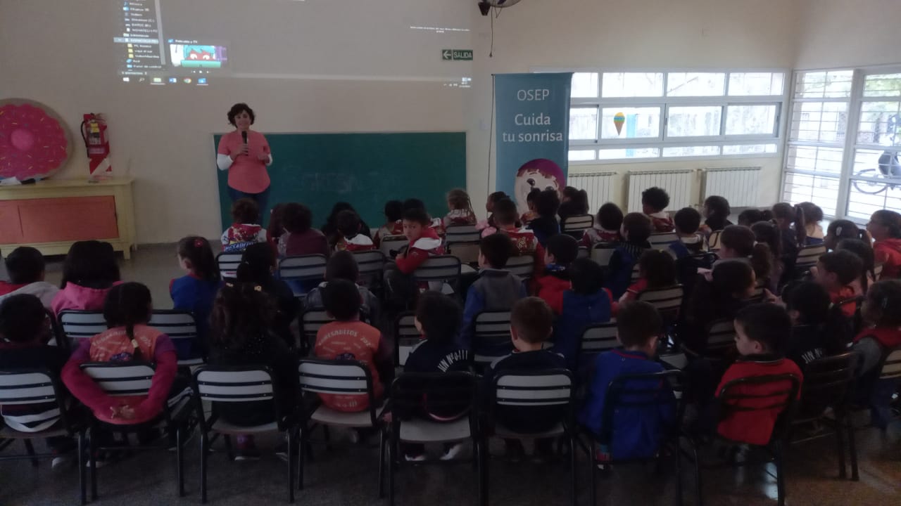 La Obra Social de los Empleados Públicos compartió una tarde saludable con los niños de la Escuela 1-291 José Villanueva de San Rafael, donde la odontopediatra Mariela Villafañe ofreció una completa charla sobre los cuidados necesarios para mantener una correcta salud bucal.