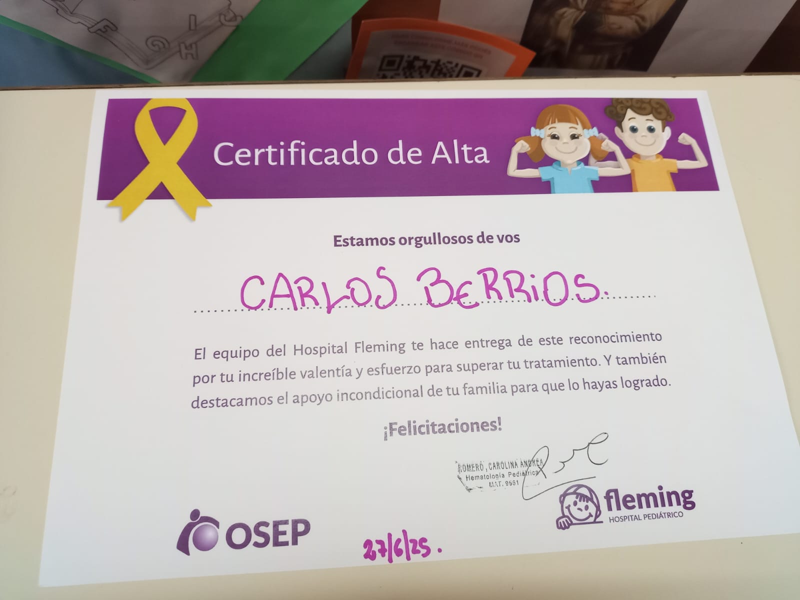 La doctora Carolina Romero, una de las hematóloga a cargo de los pacientes de onco-hematología, dio inicio a la ceremonia con palabras cargadas de afecto y profunda admiración. “Hoy celebramos el alta oncológica de un paciente muy querido nuestro, Carlitos Berrios. Hoy tiene 9 años, pero a los 3 años le hicimos el diagnóstico de leucemia. Atravesó esta enfermedad y todo su tratamiento, y por suerte, hoy podemos decir que está curado y le estamos dando el alta,” expresó la doctora, con una voz que reflejaba el inmenso orgullo y la alegría de todo el equipo médico.