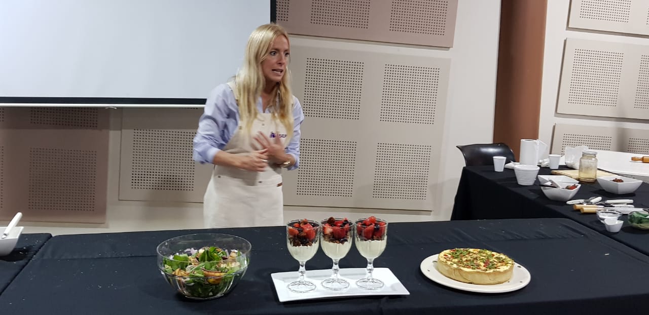 Finalmente concluyó con unas copas de crema de limón con crocante, frutillas y frutos rojos. A lo largo de la clase los presentes interactuaron constantemente con María preguntando algunas dudas, tiempos de cocción y combinaciones posibles y si hay posibilidades de reemplazar algún alimento.