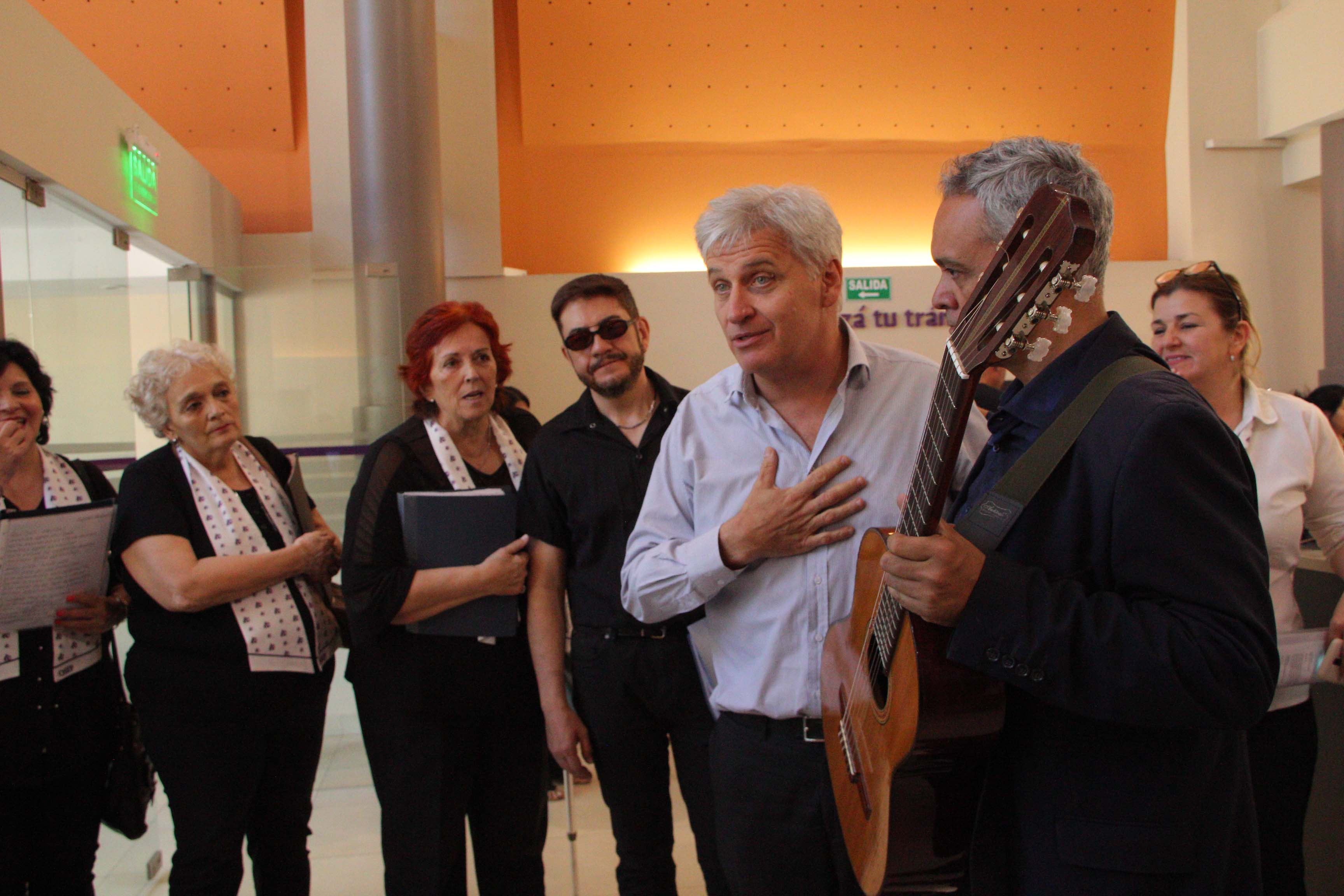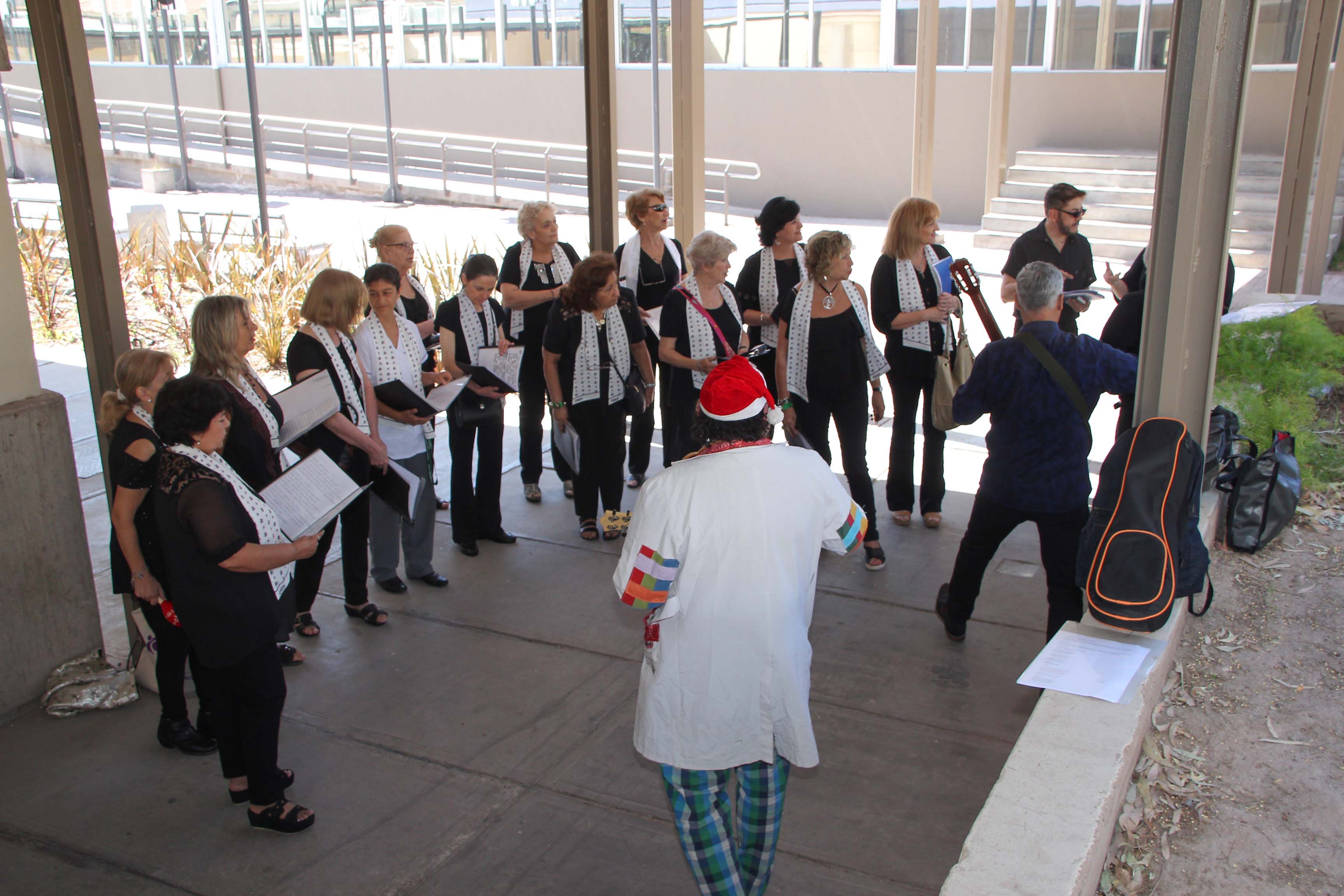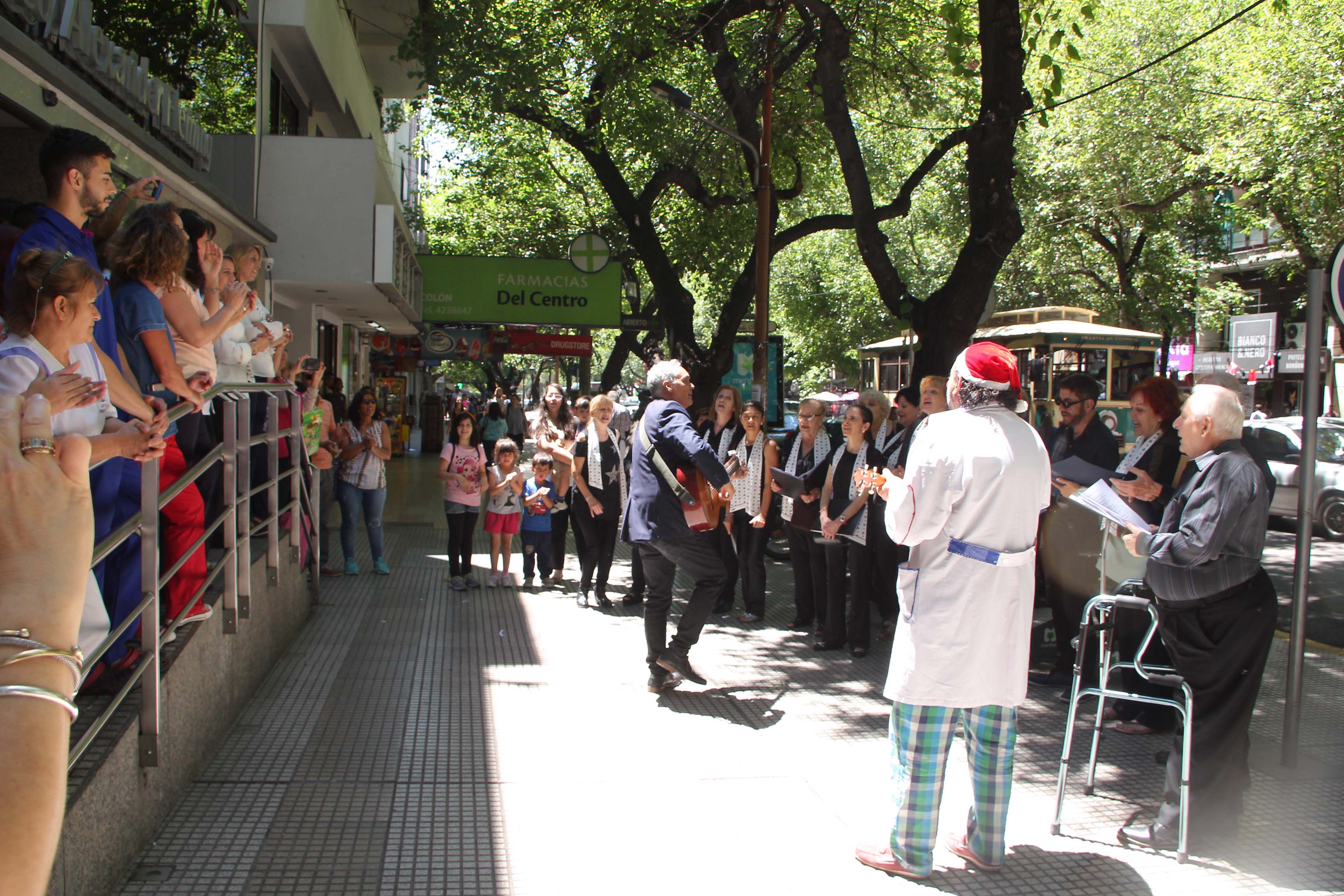 Finalmente el recorrido terminó en la entrada del Hospital Fleming. El director del coro, Andrés Iacopini animó con su guitarra en el ingreso, convocando a los transúntes, paciente y personal a cantar junto a ellos.