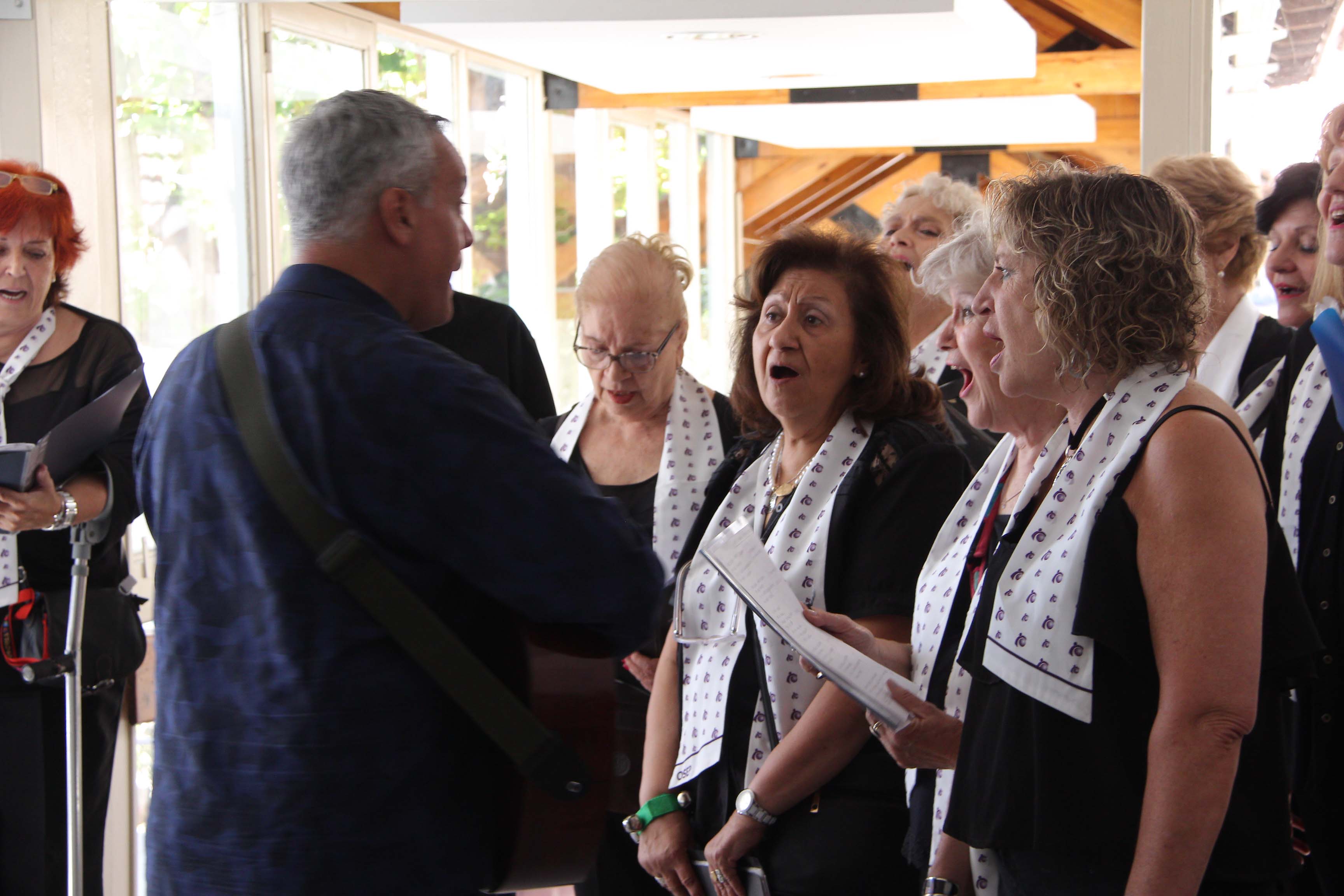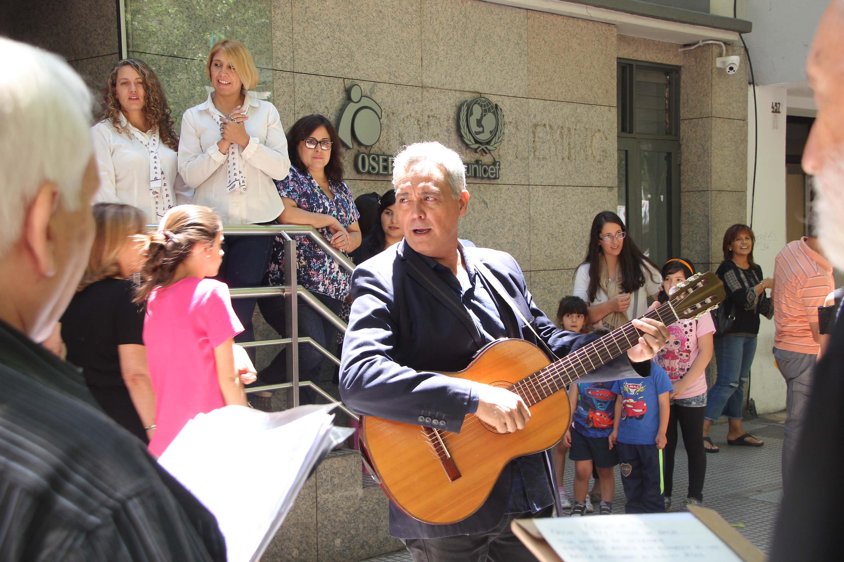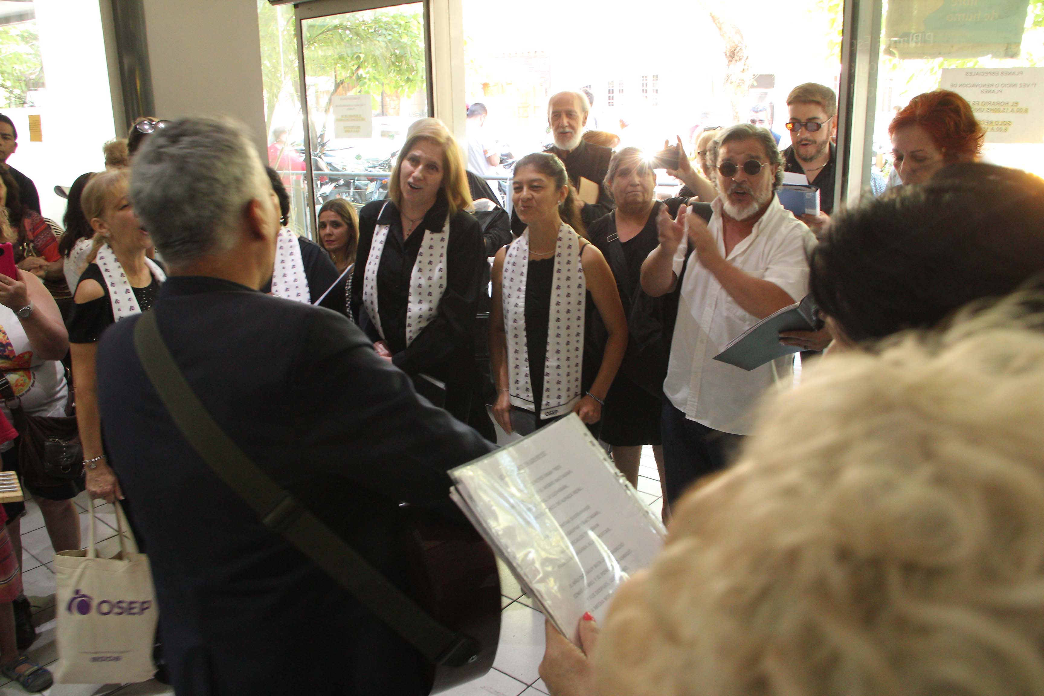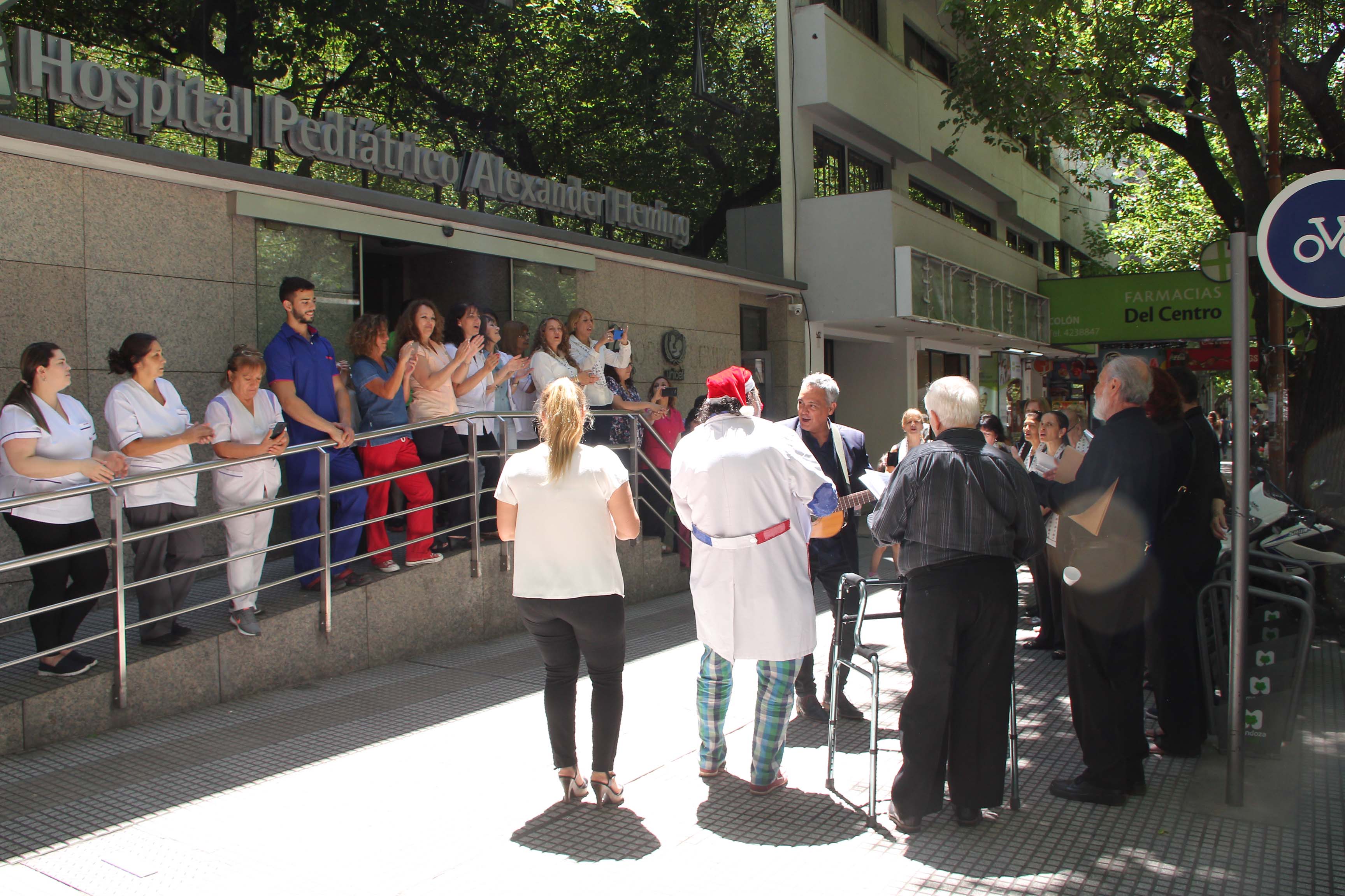 Finalmente el recorrido terminó en la entrada del Hospital Fleming. El director del coro, Andrés Iacopini animó con su guitarra en el ingreso, convocando a los transúntes, paciente y personal a cantar junto a ellos.